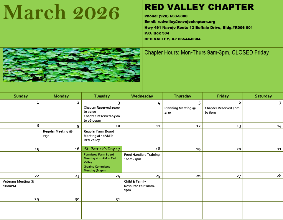 The Red Valley Chapter is dedicated to delivering exceptional services to our community through effective project development, stability, trustworthiness, and accountability. We encourage community engagement by inviting you to our monthly meetings, fostering transparency, and strengthening our local government. Together, we aim to support economic growth, promote education, and enhance the Navajo quality of life for our community, all while preserving our Navajo traditions.
